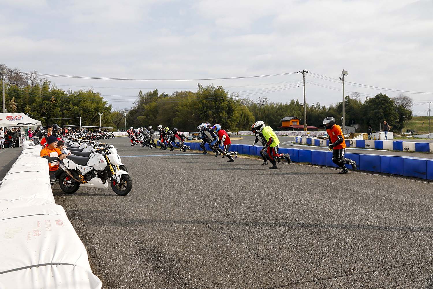 全参加者の協力もあり、直前のフリー走行終わりからの記念撮影タイムを順調に行なえたため、3時間耐久レースは予定よりも5分前倒しの午前8時55分に日章旗が振られることとなった。ル・マン式スタートで飛び出していったのはマイスタークラスの#2『RT ザ 青梅』。30分経過時点では、後続に2周以上の差をつけて#12『Team SV』が総合トップに立っていたが、その後も快調に飛ばしていく2号車は1時間経過時点で総合トップをキープ。そもそも3時間耐久の場合、ガソリン満タンでスタートするGROMはガス欠の心配がない。そのためダブルペリアのハンデをどう捉えて走行をするかということになる訳だが、この日の#2『RT ザ 青梅』は『とにかく楽しく走ろう』ということで、結果はあまり考えずにガンガン走っていたのだ。このチームのように快調に飛ばす車両もいたが、残念ながら転倒も多く発生。多重クラッシュで赤旗中断されることもあった。