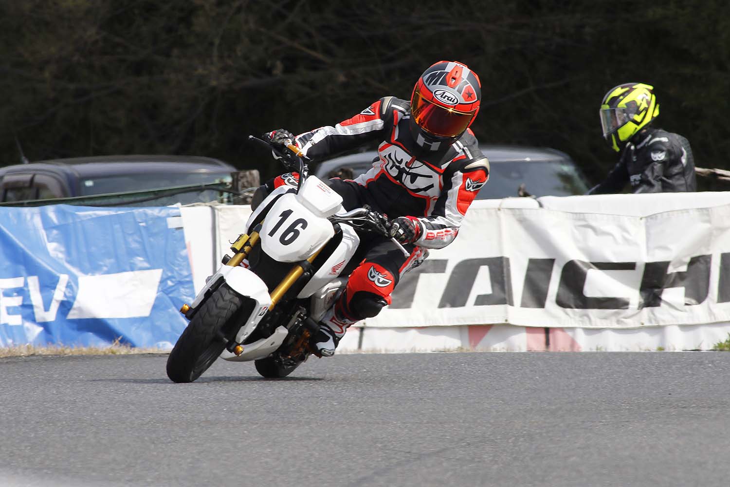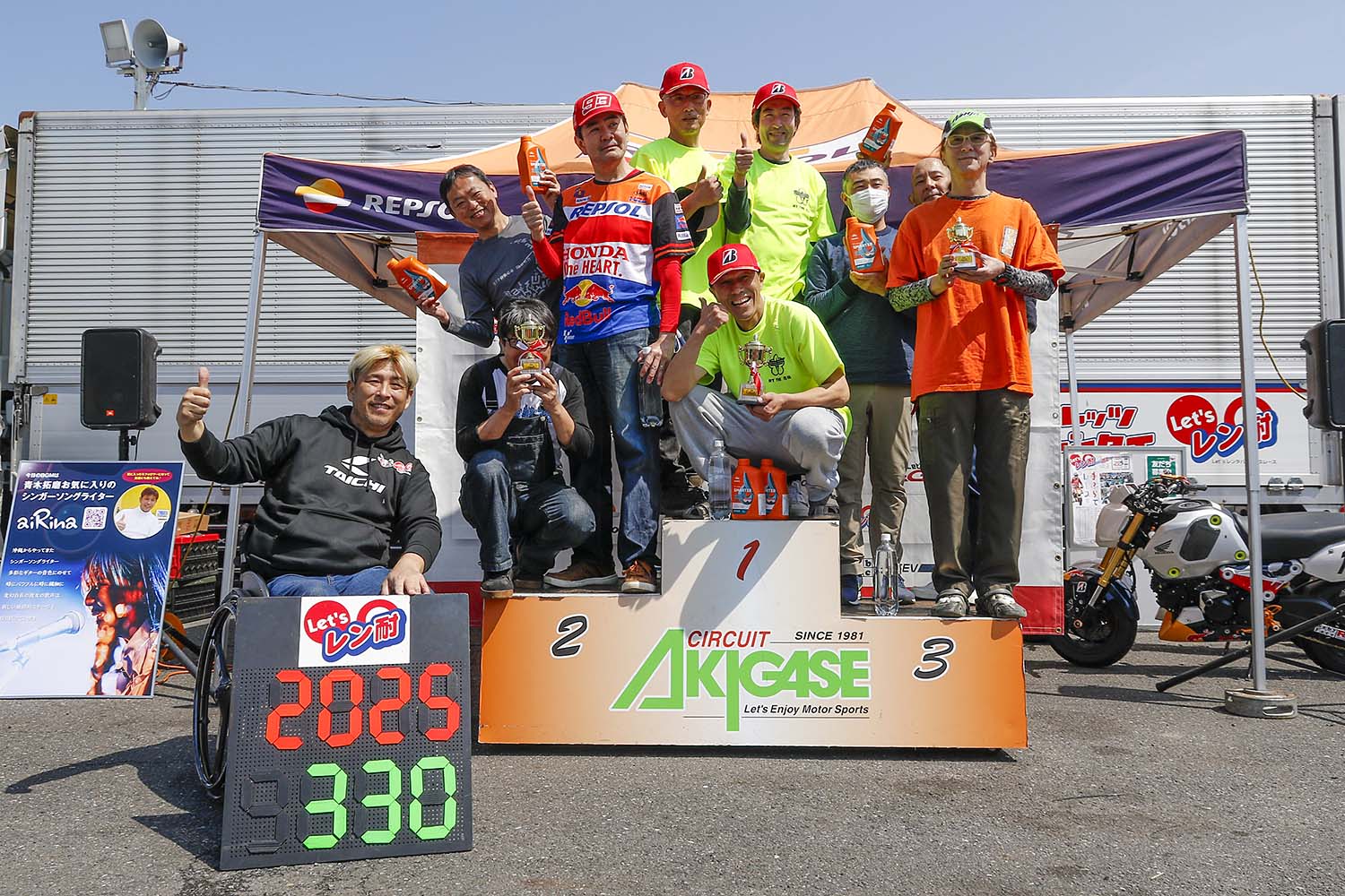 GROM5クラスを制したのは#16『TSNYレーシング』。「20数年前に草レースをやっていたけれど、久しぶりにレースをやろう」とレン耐参戦のために昨年4人で結成したチーム。昨年の筑波戦に初めて出たら「あまりに楽しくて、また筑波で走ろう」と5月4日の筑波戦に申し込んだもののいっぱいで参戦できないということだったのでこの秋ヶ瀬戦にやってきた。チーム結成2戦目ながらライダーは4名のうち2名しか参加できず、2名で走行。しかし途中で転倒を喫し、一人は救急車で運ばれる事態に。それでもと一人残り、2時間を走り続けた結果、見事な勝利となった。骨折と靱帯の損傷という診断を受けた後にペアライダーも病院から戻り、無事に二人そろって表彰台に上がっていた。