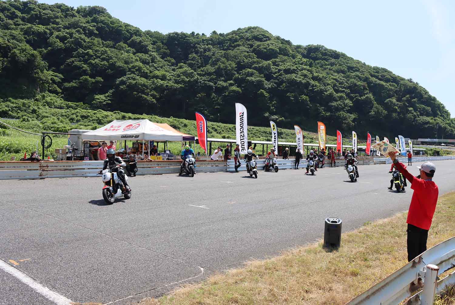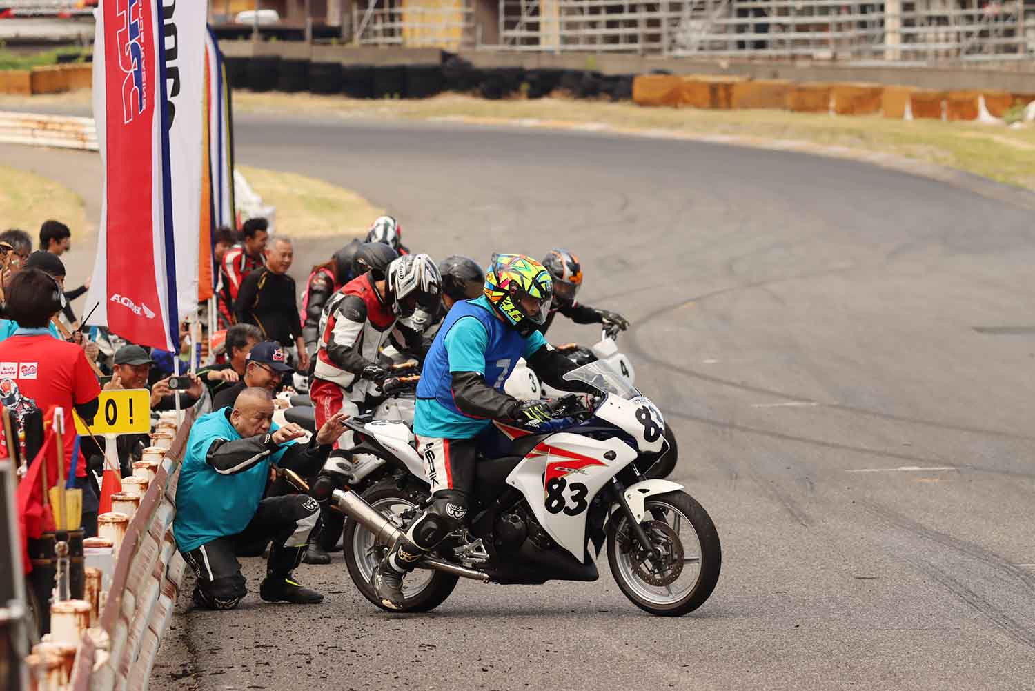 スタートは日章旗により、スタート! 排気量の大きいCBR250R #83『チーム旬』が一気に先頭へ飛び出す。