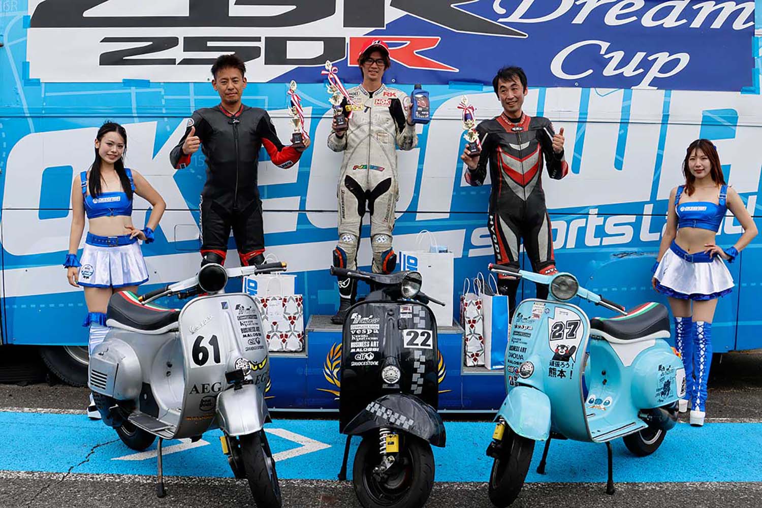当日はVespaGPのエキシビションを含め76台が出走し、多くの観客にご来場いただき大変にぎわいのある一日となりました。single4-Eクラスでは、全日本ST600で活躍中の長尾健吾選手が参戦し、コースレコードを更新する快走で大きな声援を浴びました。参加者の皆様からも積極的なお声がけをいただき、シリーズの盛り上がりにつながっておりますことを心より感謝申し上げます。