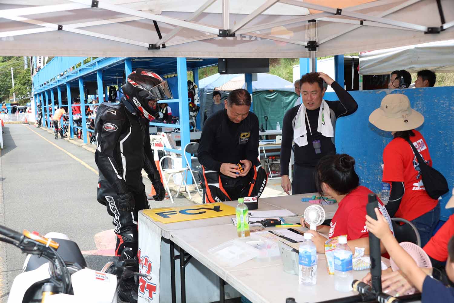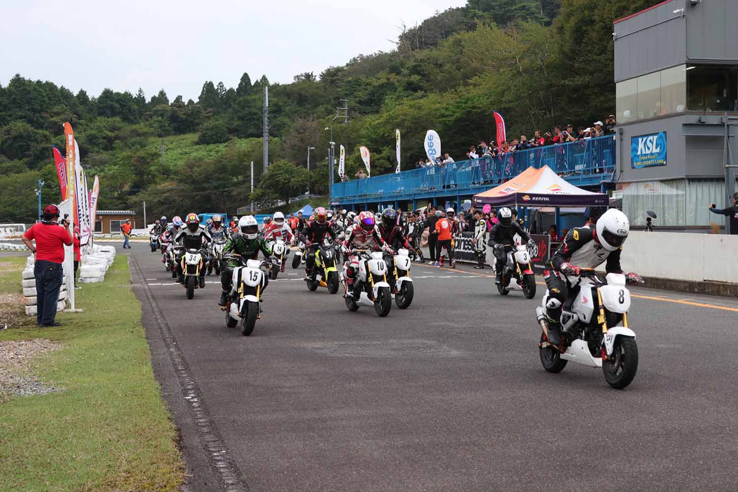 この日の近畿スポーツランドは朝から曇り。そのため気温の上昇も抑えられたなかでの5時間の耐久レースに26チーム119名が集結した。今回は、全クラスを対象にペリア方式ハンデを導入。Grom5車両に2リットル、Grom4車両に3リットルの追加給油がなされる。また、ミニゲームはピットイン5回ごとに課され、ライダー以外のチームスタッフがこれをこなさなければならない、というレギュレーションとなる。