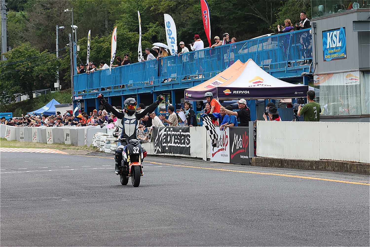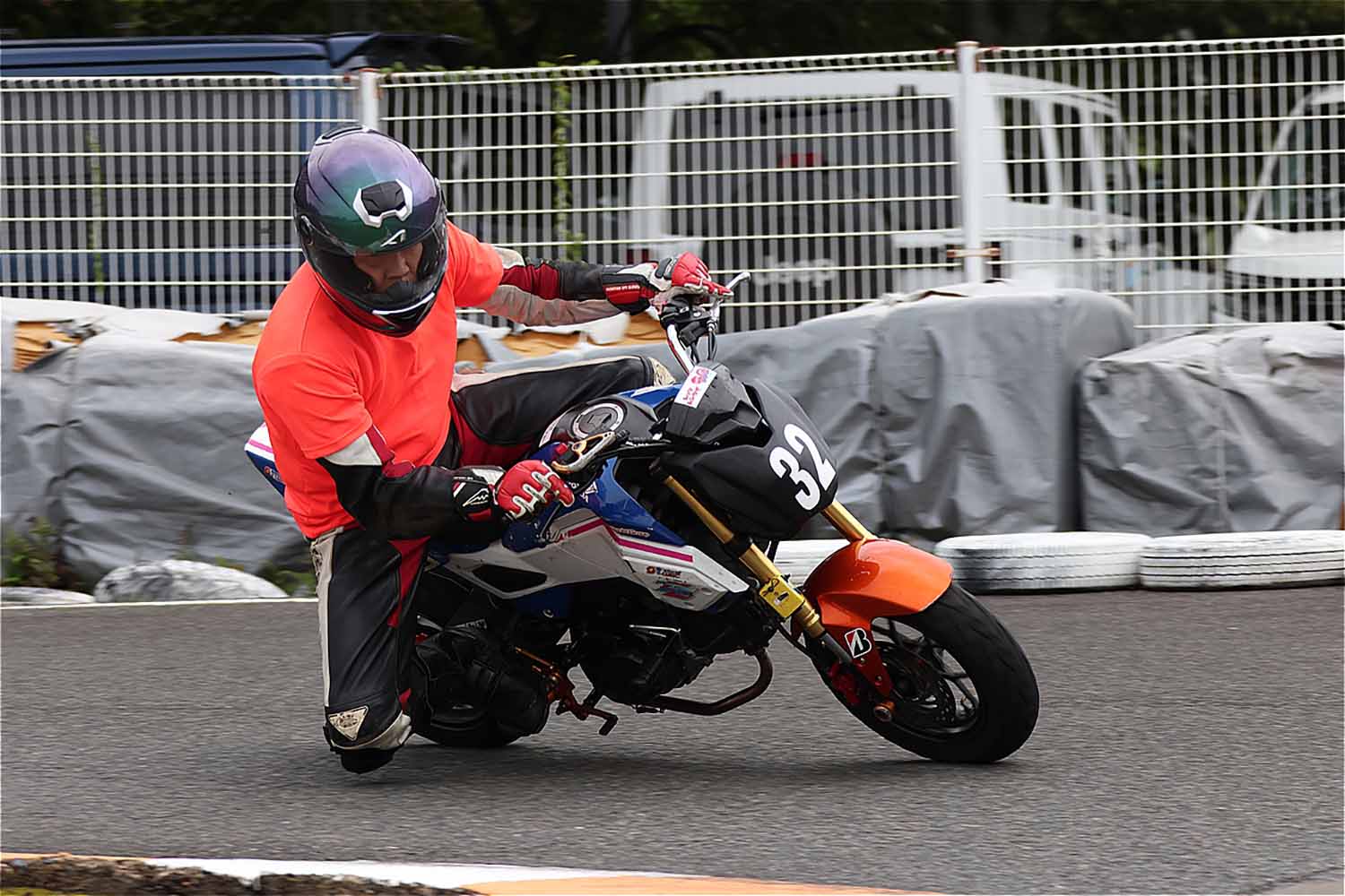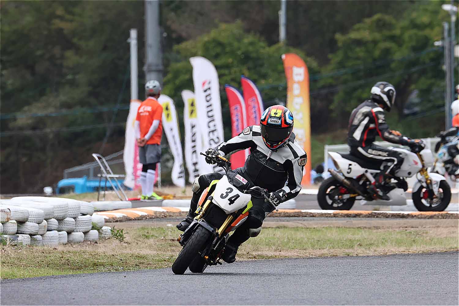 ル・マン式スタートで飛び出していき、オープニングラップをトップで戻ってきたのは、#15『アプリリア友の会with五平餅』、それを追いかけるのが#1『チームカメッチ』、#8『サーカムれいしんぐ』。一方、Grom4クラスでは#39『Team KIYO plus M』、#31『HBはんぺん』、#36『INAZUMA RACING』というオーダーであった。