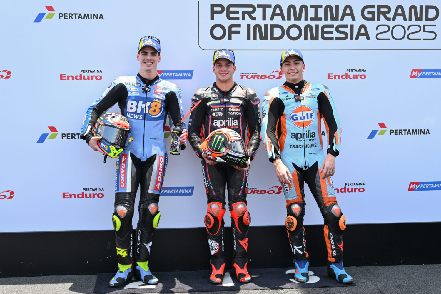 2番手は6周目1分29秒230をマークしたフェルミン・アルデゲール(ドゥカティ)。ベゼッキとは0.398差で自身MotoGPクラス初めてのフロントロウとなった。3番手は、ファン投票によるガルフカラーで参戦中のラウル・フェルナンデス(アプリリア)で8周目1分29秒284を記録した。こちらは2024年ドイツGP以来のフロントロウ。アプリリアがフロントロウに2台並ぶのも2024年のドイツGP以来となる。4番手タイムとなる1分29秒336を出したアレックス・リンス(ヤマハ)はその後15コーナーで転倒。アレックス・マルケス(ドゥカティ)も転倒し、イエローフラッグのため最終盤はタイム更新が難しかった。