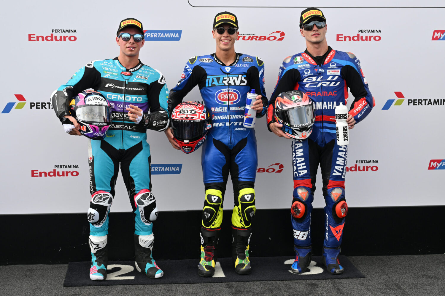 日本時間午後2時40分(現地時間午後1時40分)から15分で争われた予選Q1は、再び強いと10km/hを超える風が吹いていた。序盤、1コーナーでフロントが滑り転倒しそうになったフィリップ・サラッチ(ボスコスクーロ)の後ろを走行していた地元インドネシア人ライダーのマリオ・アジ(カレックス)が避け切れず転倒。セレスティーノ・ビエッティ(ボスコスクーロ)はグラベルへ入るなど、路面コンディションが悪いようだった。結果は、アレックス・エスクリグ(フォワード)が1分32秒876でトップ、2番手サラッチ1分32秒990、3番手イザン・グエバラ(ボスコスクーロ)1分33秒052、4番手ビエッティ1分33秒074。以上4名がQ2進出を果たした。2023年このサーキットで、ASB1000のレース中の多重事故のため無くなった埜口遥希のステッカーをヘルメットに貼って参戦している國井は6周目1分33秒709を記録して12番手。