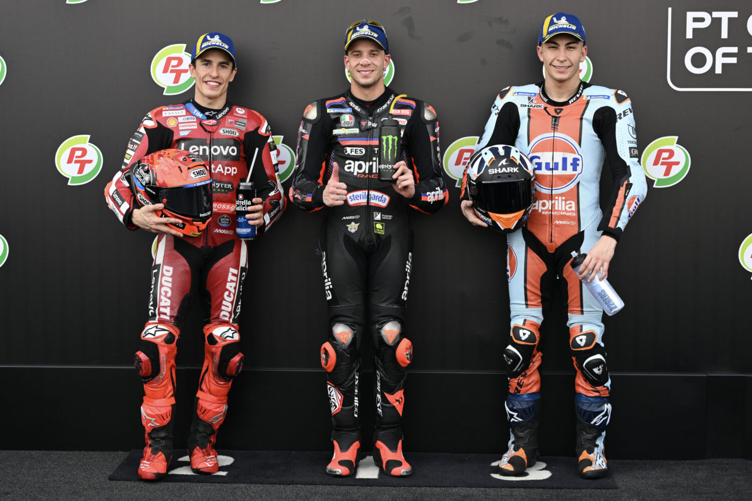 日本時間午後7時15分(現地時間午前11時15分)から15分間で争われた予選Q2は、気温20度、路面温度18度、湿度52%、秋晴れのドライコンディション。2周目トップタイムだったのは、フリー走行2で転倒のあったペドロ・アコスタ(KTM)だった。1分29秒298を記録し、2023年にマーベリック・ビニャーレスが記録した1分28秒981のコースレコードに迫った。