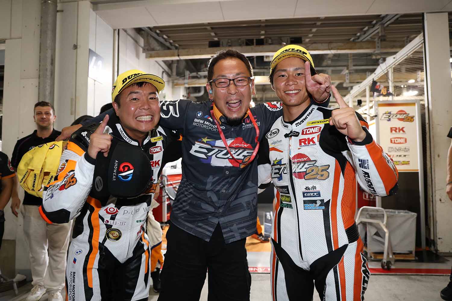 2025年鈴鹿8耐でSSTクラス優勝を喜ぶTeam Étoile市川貴志代表(中央)