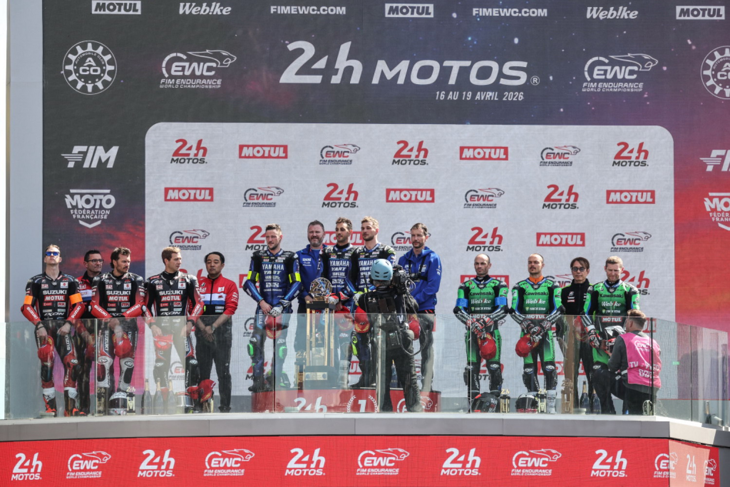 2位にYoshimura SERT Motul(スズキ:G.ブラック/E.マッソン/D.リンフット)が入賞。Yoshimura SERT Motulは序盤からECUに小さなトラブルを抱えながらも常にトップ4圏内をキープして周回を重ね、854周を回って2位に入賞。3位にKawasaki Webike Trickstar(カワサキ:R.ラモス/C.ガマリーノ/G.レブラン)が848周で3位に続き、ブリヂストンタイヤユーザーが総合(EWCクラス)の表彰台を独占した。