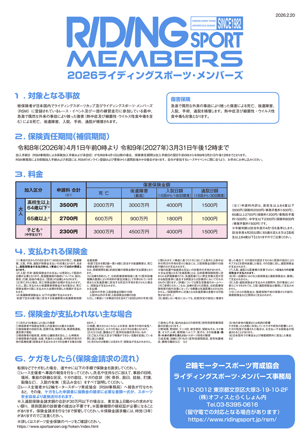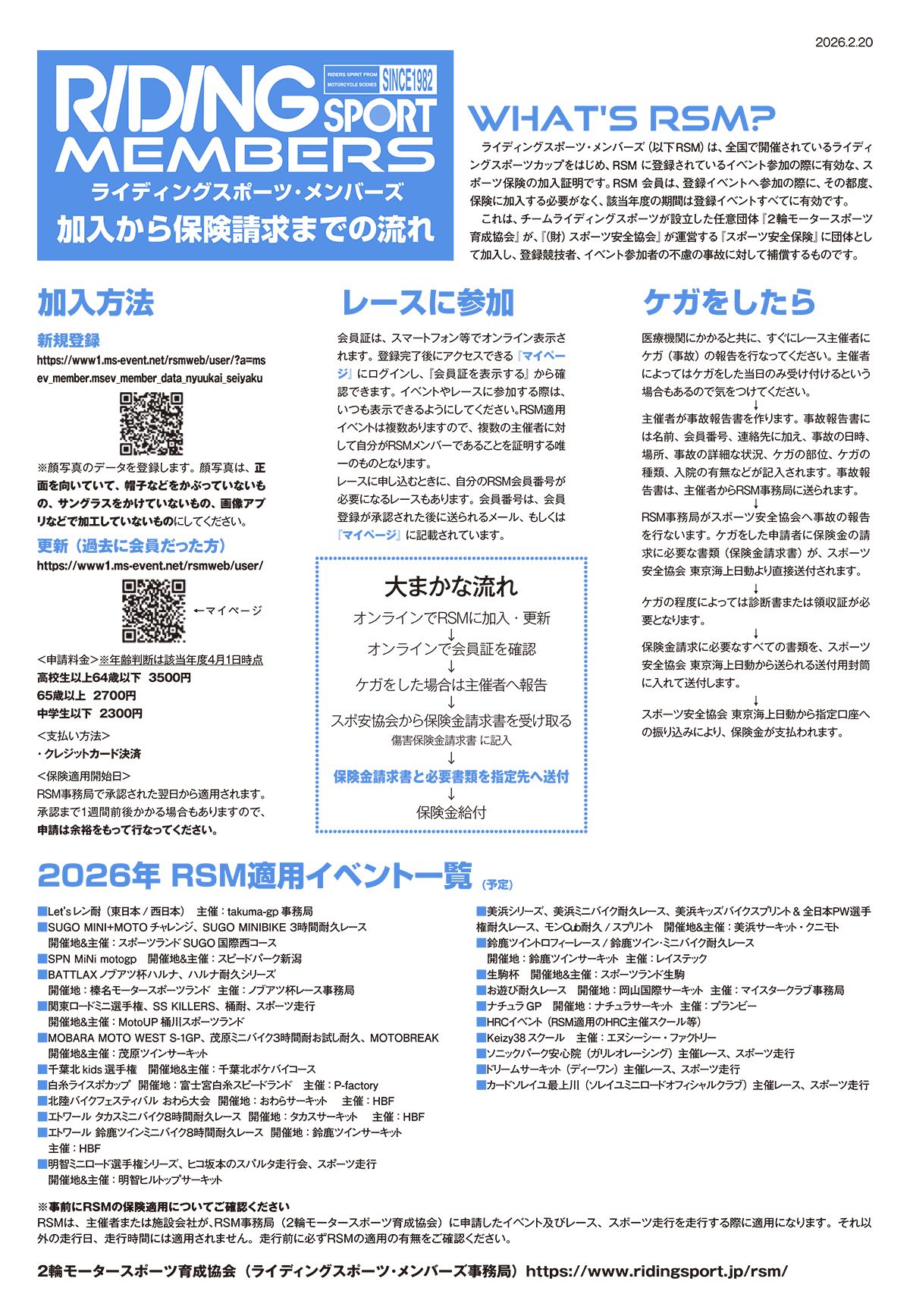 ライディングスポーツ・メンバーズ(以下RSM)は、チームライディングスポーツが設立した任意団体『2輪モータースポーツ育成協会』が、『(財)スポーツ安全協会』が運営する『スポーツ安全保険』に団体として加入し、登録競技者、イベント参加者の不慮の事故に対して補償するものです。